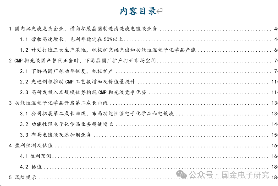 2)行业竞争加剧。公司是国内化学机械抛光液龙头公司,目前鼎龙股份和上海新阳均有布局抛光液业务,如果该项业务进展加剧,公司将面临份额下降和毛利率下降的风险。功能性湿电子化学品竞争相对较大,公司如果不能获得明显的竞争优势,功能性湿电子化学品的毛利率同样面临下降的风险。