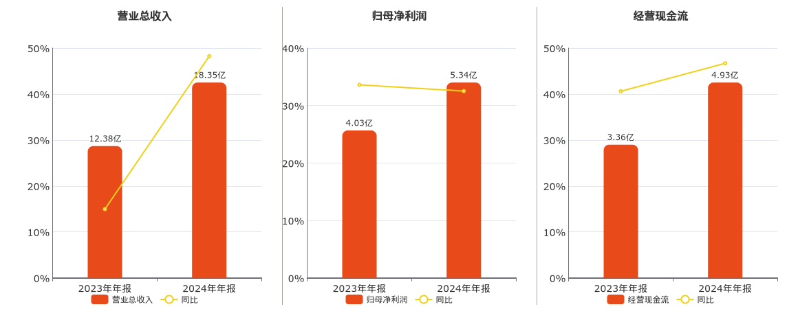 公司营业总收入为18.35亿元。归母净利润为5.34亿元。经营活动现金净流入为4.93亿元。