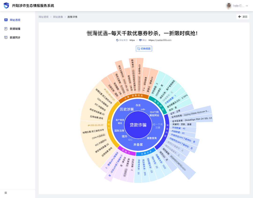 依托“网络空间治理145体系”,安恒神盾局开发出开阳黑灰产生态监测情报系统一体机,通过建立多维标签体系,实现黑灰产网址分类、分级,充分利用网络犯罪黑灰产情报赋能公安、网信、工信等行业主管部门统筹行业监管,支撑电信运营商、互联网企业完善内部涉诈信息监测识别和处置体系。