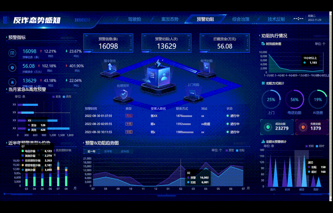 安恒神盾局深入挖掘预警数据使用安全以及公安预警劝阻业务系统化建设要求,推出天权电信网络诈骗预警劝阻系统,满足反诈中心“驾驶舱”、“移动端”两端联动需要,围绕“数据融合”、“任务流转”、“劝阻考核”、“辅助决策”四类重点场景,构建基于公安内网的多级预警劝阻体系。