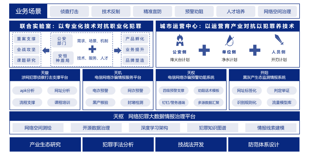 安恒神盾局响应国家号召,坚持“防御为先,以攻促防”的理念,肩负“以专业化技术对抗职业化网络犯罪”的使命,围绕“侦查打击”、“技术反制”、“精准宣防”、“预警劝阻”、“人才培养”、“网络空间治理”等场景,提供覆盖反诈业务全流程的一体化解决方案。