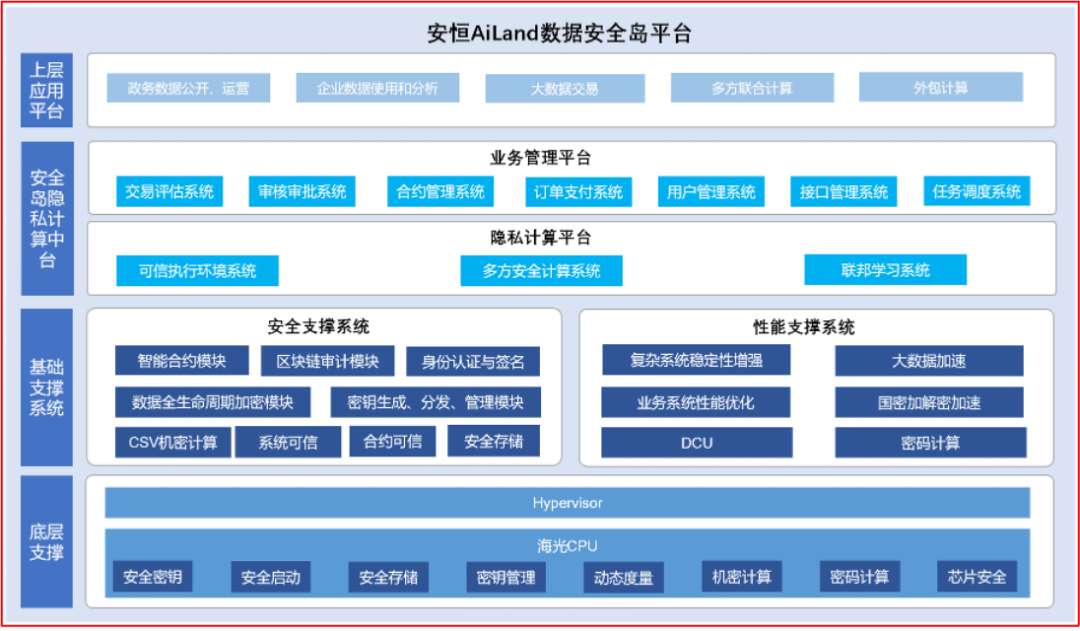 AiLand数据安全岛隐私计算平台信创解决方案,支持底层硬件鲲鹏和海光两种处理器。