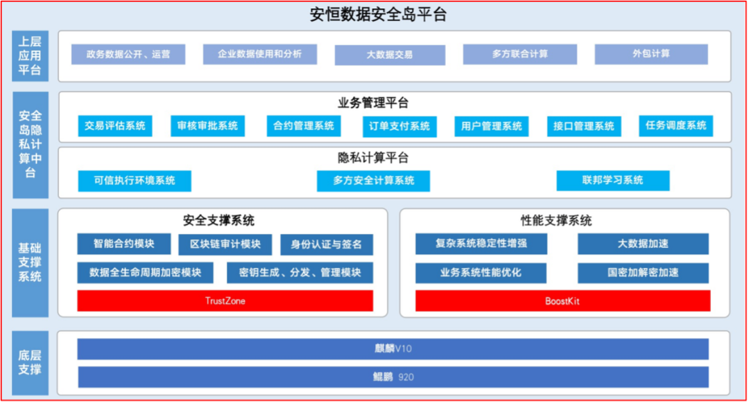 ●基于鲲鹏硬件TrustZone打造安全可靠的TEE计算环境,并适配了OpenEuler操作系统,全方位的保障了数据计算过程中的安全,真正实现了“数据可用不可见”。