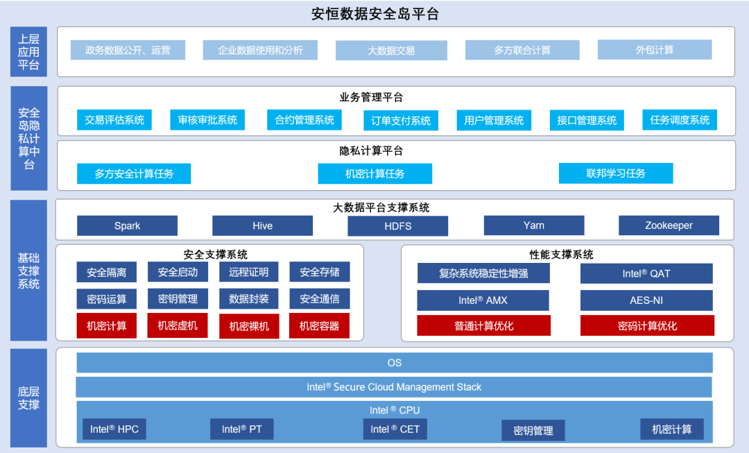 基于Intel CPU的SGX技术将安全硬件与应用系统的计算任务、数据合约绑定,为用户提供了从硬件到软件的,数据全生命周期的安全保护。使用了Intel AMX和AES-NI技术,分别对AI运算以及密码计算实现了指令集加速。