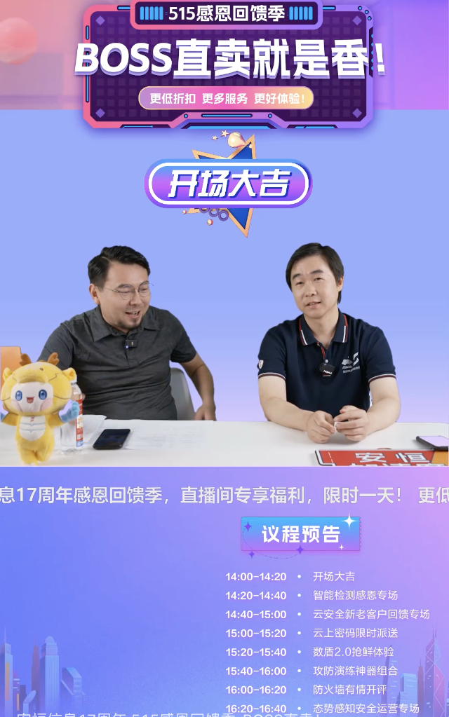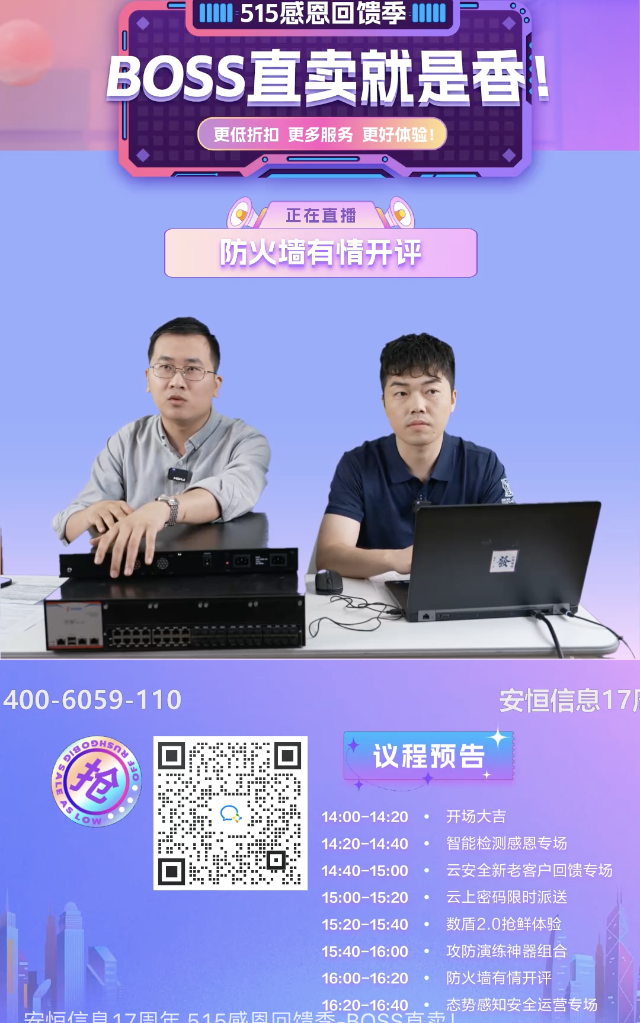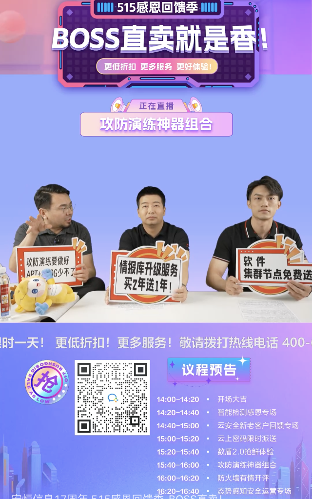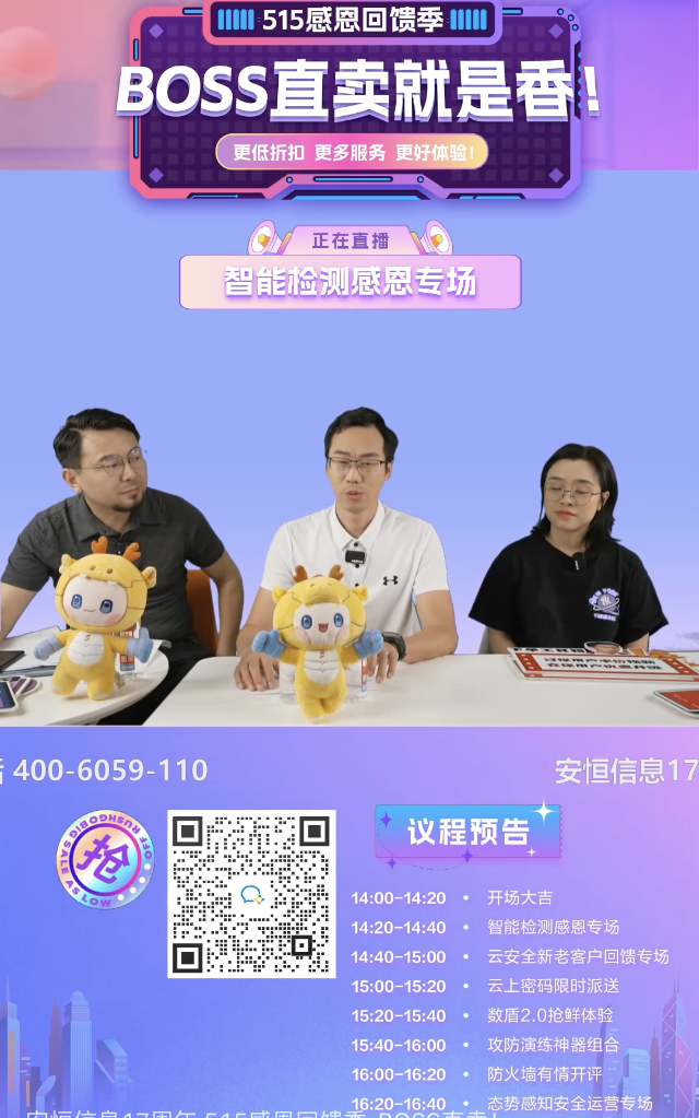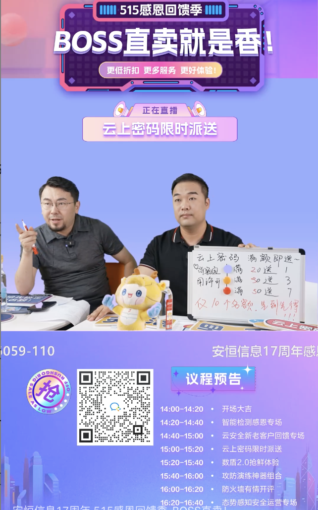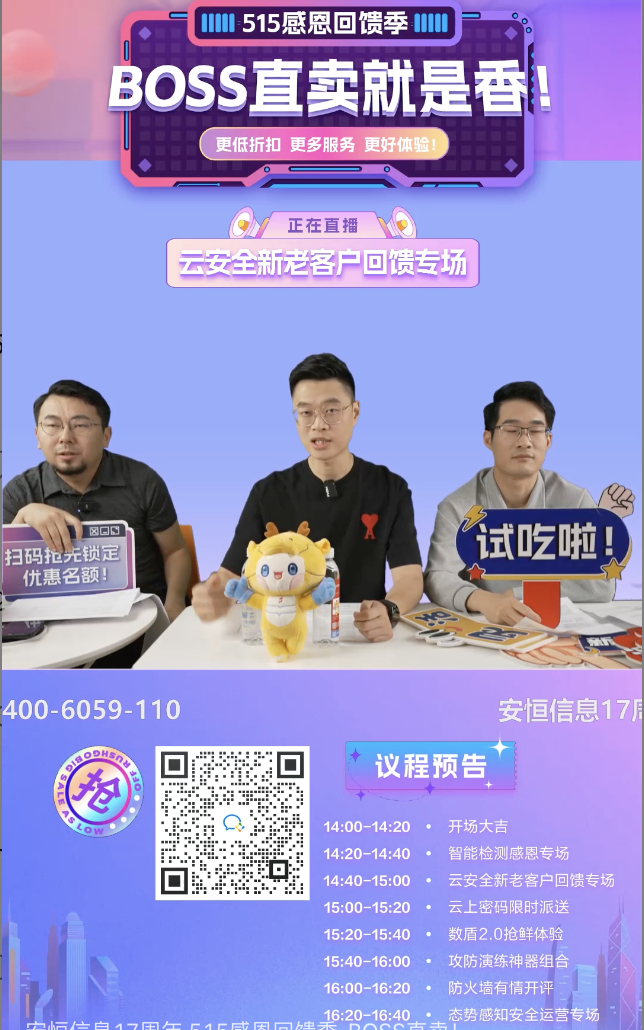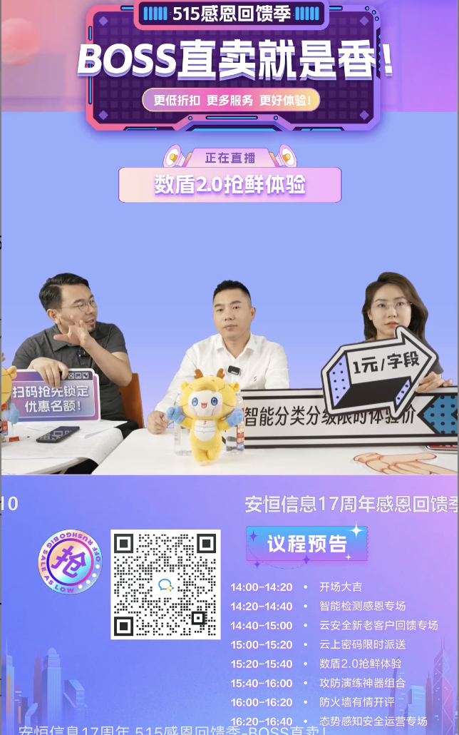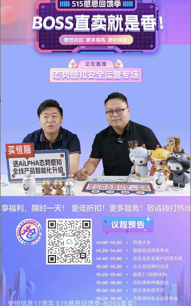 优惠火热进行,惊喜连连不断。此次515“感恩回馈季”直播不仅是产品展示的舞台,更是安恒信息与客户情感交流的桥梁。