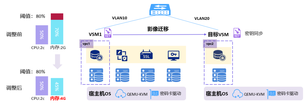 在密码服务调用高峰期时,管理员可灵活进行CPU/内存资源动态调整,纵向扩容单个VSM服务负载能力;亦可指定某个VSM通过影像迁移来扩展密码服务数量,增强密码服务的负载能力。