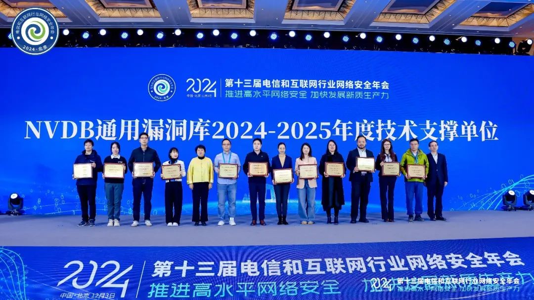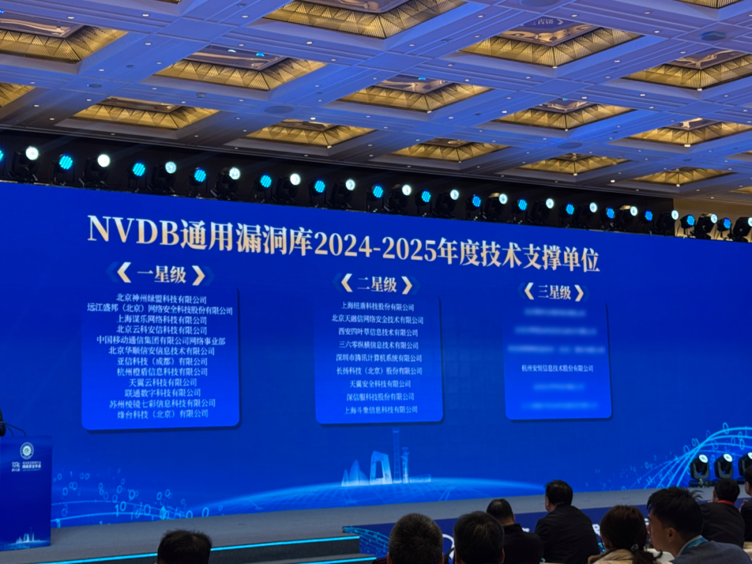 近日,2024年第十三届电信和互联网行业网络安全年会在北京召开。在会上,工信部网络安全威胁和漏洞信息共享平台(NVDB)通用网络产品安全漏洞专业库对2024-2025年度技术支撑单位进行授牌,安恒信息凭借在网络产品安全漏洞管理方面作出的杰出贡献,被授予“三星级技术支撑单位”(最高级)荣誉。