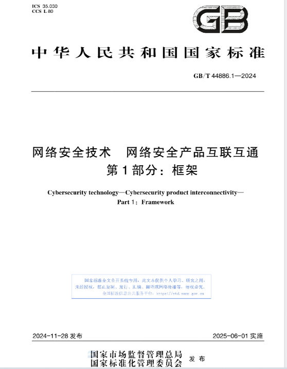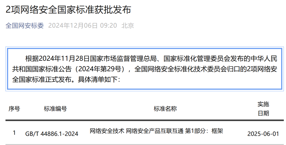 12月6日,全国网络安全标准化技术委员会发出通知,我国首项网络安全产品互联互通国家标准GB/T 44886.1-2024《网络安全技术网络安全产品互联互通第1部分:框架》正式发布,并将于2025年6月1日正式实施。