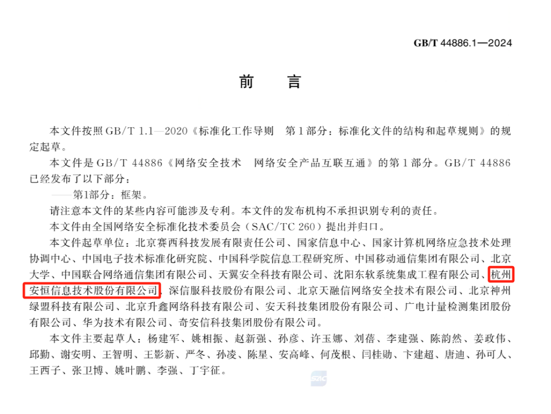 安恒信息作为首项网络安全产品互联互通国家标准《网络安全技术网络安全产品互联互通第1部分:框架》的核心起草单位和试点应用推广单位。全方位深度参与网络安全产品互联互通国家标准体系的研究制定和试点验证工作。