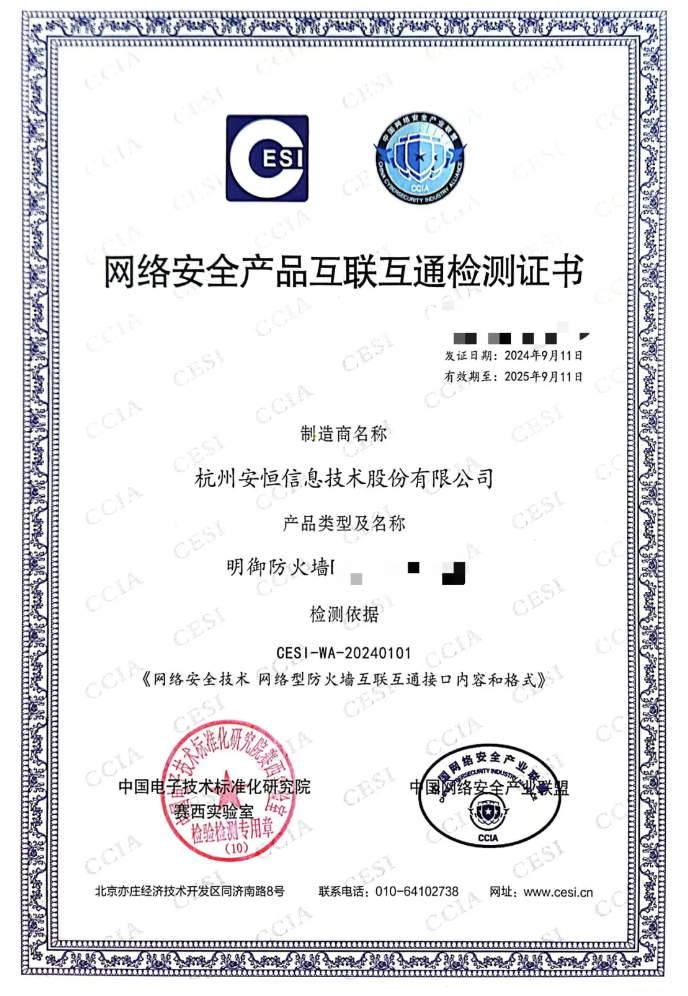 在今年9月国家网络安全宣传周--网络安全标准与产业研讨会上,安恒信息防火墙和病毒防治产品成功入选首批“网络安全互联互通功能产品”。