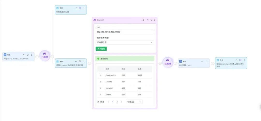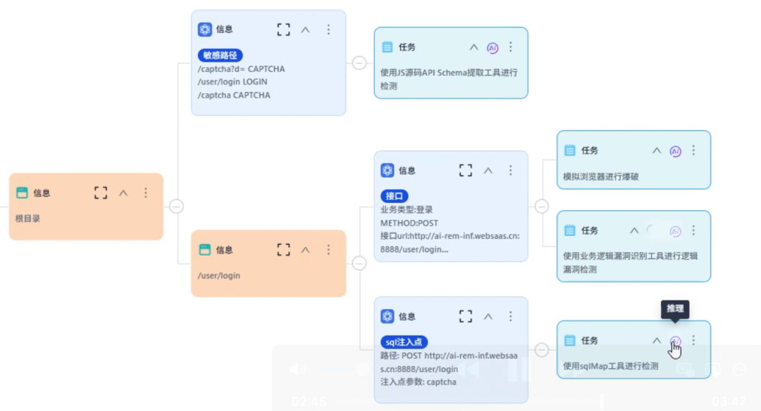 智能体以任务树的形式,展现出在测试过程中由AI发现的风险点,并由AI自主规划出下一步任务和对应的工具,如此持续研判-推理-执行-再研判,直至该风险点彻底排查清楚。