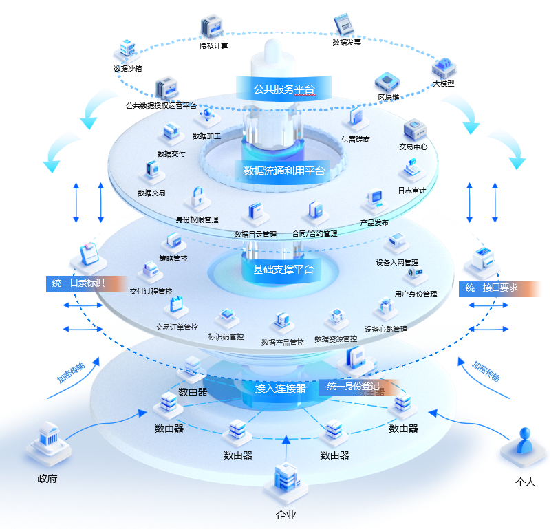 异构适配:数由空间的架构可以灵活适配参与方不同的业务平台,如公共数据授权运营平台、数据交易平台等