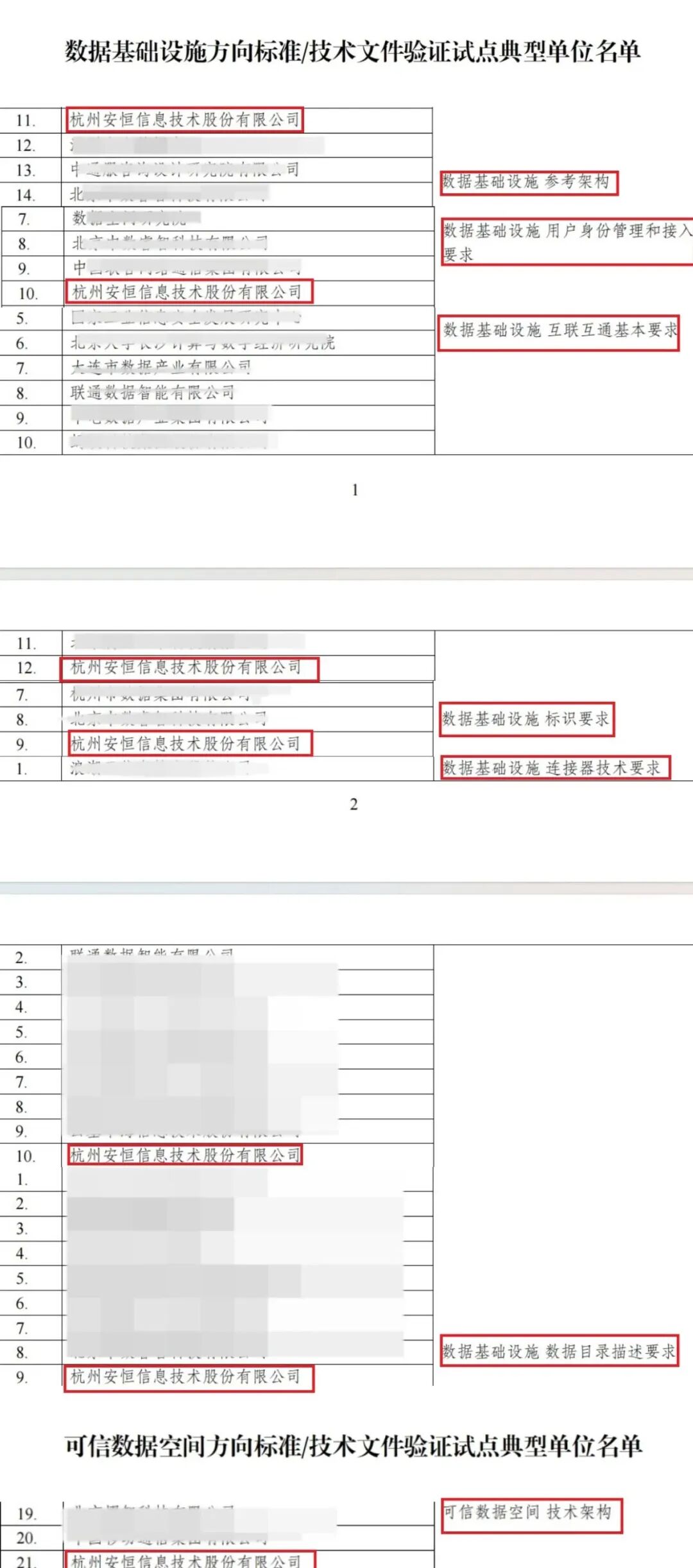 近日,在国家数据局指导下,全国数据标准化技术委员会开展了数据基础设施、可信数据空间等6大重点方向标准和技术文件的标准验证试点工作。经形式审查、标准验证、报告评审等层层审核,安恒信息入选数据基础设施方向和可信数据空间方向的全部6个标准及1个技术文件的验证试点典型单位。这标志着安恒信息在数据领域的技术实力和实践成果获得国家级认可!