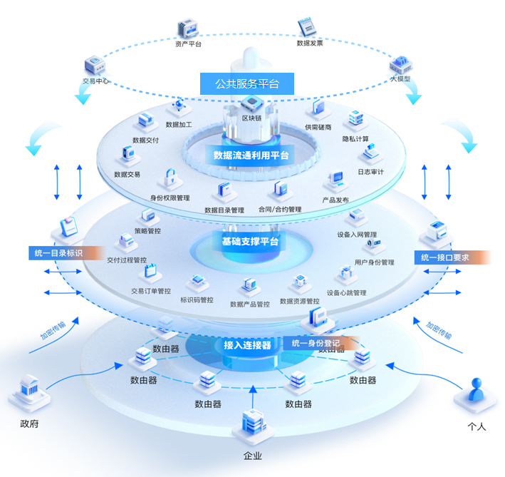 其架构清晰,就像搭积木一样分层构建:最底层是“数由器”(数据接入终端),中间是基础支撑平台和数据流通利用平台,再加上动态安全防护和统一对接服务保驾护航。