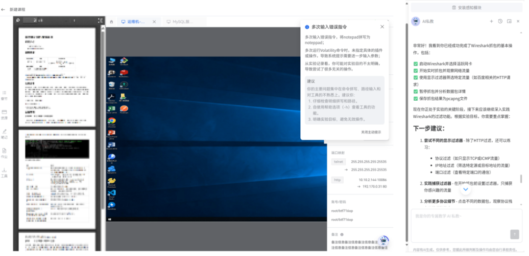 正如报告所强调:“AI不仅是工具,更是靶场智能化的核心引擎。”基于“恒脑安全垂域大模型”的强大能力,我们打造了“恒脑垂域一体机+靶场”的智能化网络安全人才培养解决方案。该方案以“AI私教”为核心理念,全面重构传统教学与实训模式,推出全局智能问答、课程自动生成、实验过程智能辅助、赛题智能推荐与动态调整等一系列创新功能,实现从“经验驱动”向“智能驱动”的跨越。