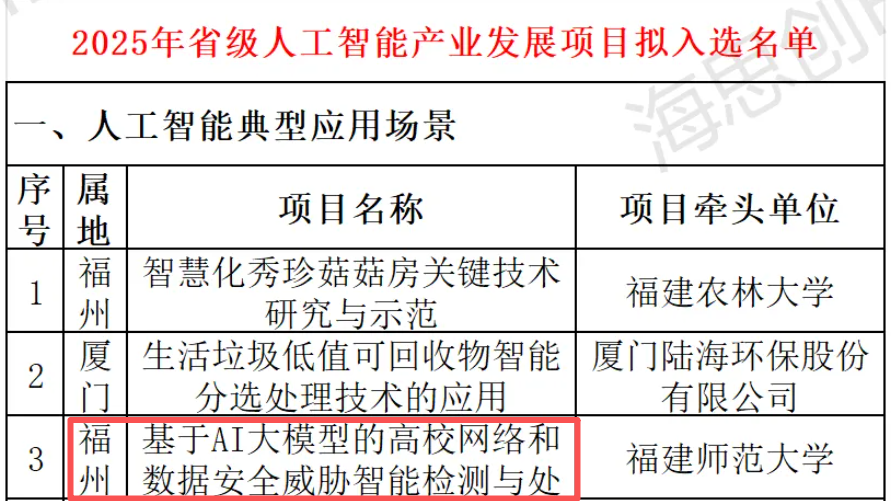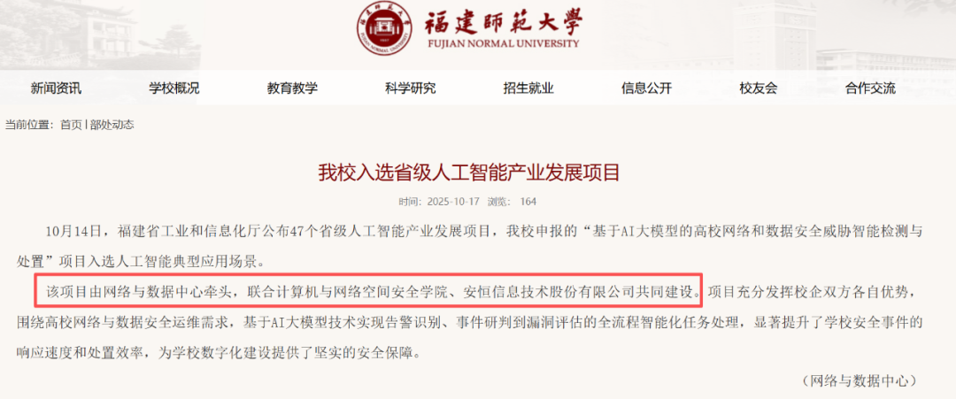 近日,福建师范大学官网发布新闻:福建师范大学申报的“基于AI大模型的高校网络安全智能检测与处置”项目入选福建省省级人工智能典型应用场景。该项目由学校网络与数据中心牵头,联合计算机与网络空间安全学院、安恒信息共同建设。
