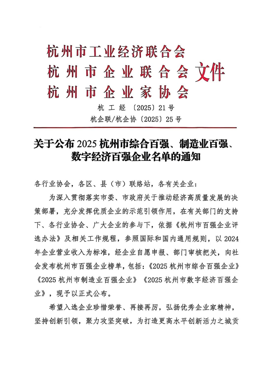 近日,杭州市工业经济联合会、杭州市企业联合会、杭州市企业家协会联合发布2025杭州市综合百强、制造业百强、数字经济百强企业名单,安恒信息凭借在数字经济领域的卓越贡献与技术实力,获2025杭州市数字经济百强企业。这已是安恒信息连续第二年获此殊荣,充分体现了公司在数字经济浪潮中持续增强的创新活力与行业领先地位。