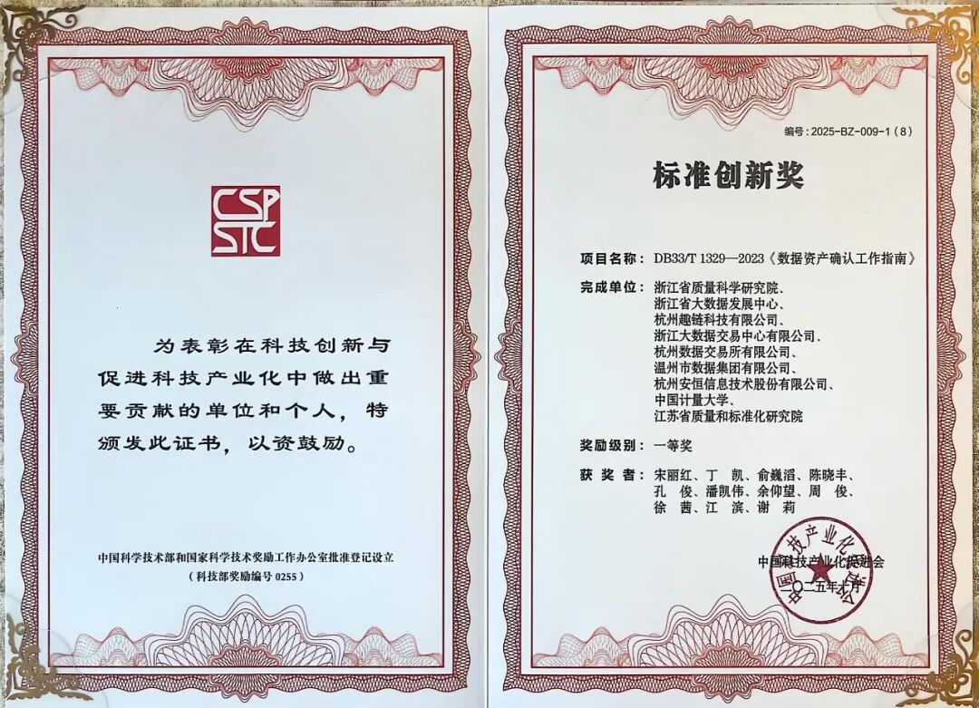 近日,经中国科学技术部和国家科学技术奖励工作办公室批准登记设立(科技部奖励编号0255)的第五届中国科技产业化促进会“科学技术奖”评选揭晓,由浙江省质量科学研究院、浙江省大数据发展中心、杭州趣链科技有限公司、浙江大数据交易中心有限公司、杭州数据交易所有限公司、温州市数据集团有限公司、安恒信息、中国计量大学、江苏省质量和标准化研究院共同完成的DB33/T 1329-2023《数据资产确认工作指南》(以下简称指南)荣获“标准创新奖”一等奖。