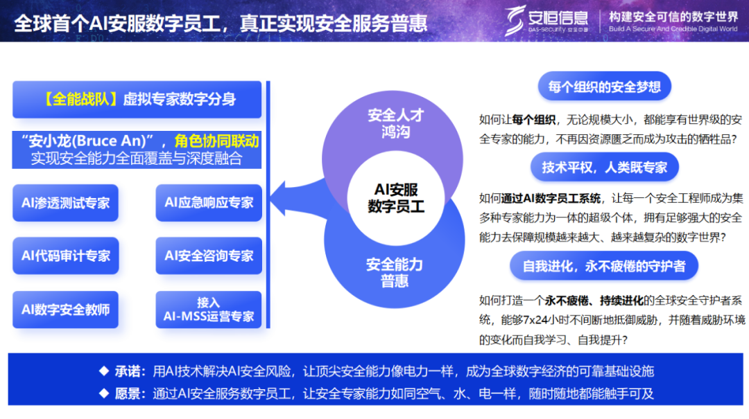 同时为实现安全能力的普惠化落地,今年, 安恒信息 全球首发AI安服数字员工——安小龙,作为集渗透测试、应急响应、代码审计、安全咨询、安全培训等能力于一体的虚拟专家团队。“安小龙”深度融合了 安恒信息 18年来的实战经验与技术积累,具备7×24小时持续在岗、同时服务上千客户的能力,真正实现了专家能力的“裂变式复制”,让中小企业也能享有世界级的安全服务。