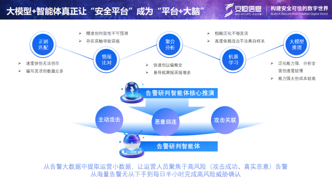 为应对上述挑战,王欣提出,一方面 安恒信息 通过大模型+智能体,真正让“安全平台”成为“平台+大脑”。实现对环境风险的自主感知、自动化研判与调查取证,使人力得以聚焦于真正需要介入的高风险事件。
