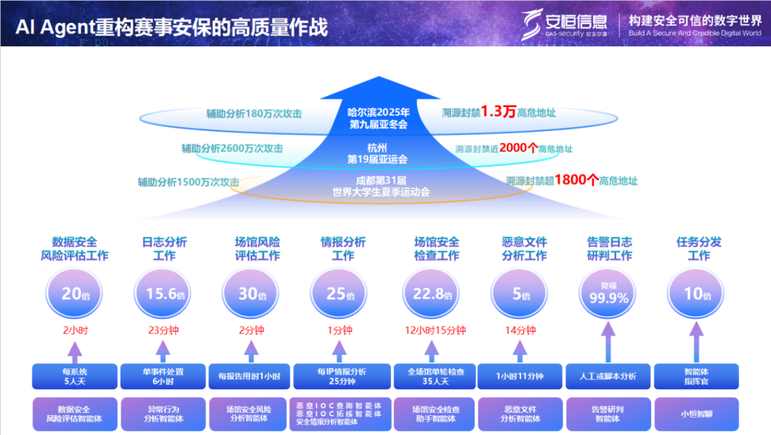 另一方面,通过具备自主思考、规划与执行能力的AI智能体协同作战,企业可实现从“告警疲劳”到“主动智能”的运营范式转变。以亚运会重大赛事中的实战案例为例, 安恒信息 通过智能体协同作战,在短短几天内拦截了180万次攻击,其中90%以上的工作都是由智能体完成,且情报收集时间从20分钟缩短到5秒,安全工作通过智能体再度回归脑力工作,展示了智能体在赛事网络安全保障中的强大能力。