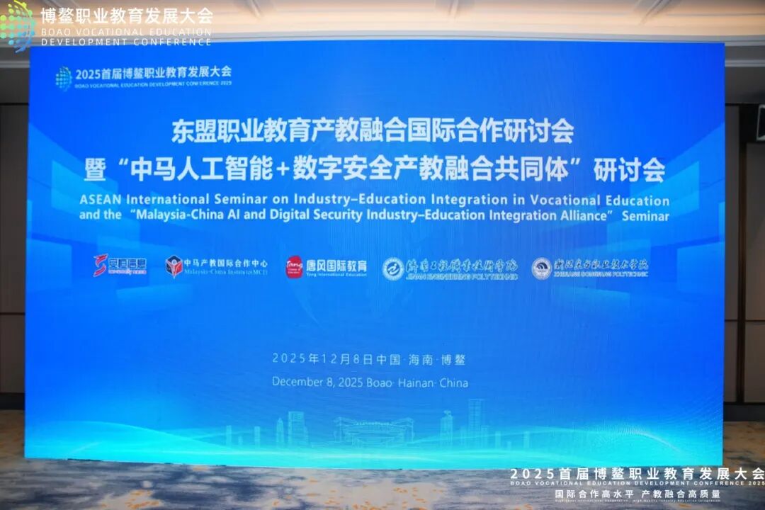 2025 年 12 月 8 日,东盟职业教育产教融合国际合作研讨会暨中马人工智能+数字安全产教融合共同体研讨会在海南博鳌顺利召开。本次研讨会在中马产教国际合作中心(MCI)的指导下,由博鳌职业教育发展大会组委会主办,唐风国际教育集团、 安恒信息 承办, 济南工程职业技术学院 、 浙江东方职业技术学院 协办。