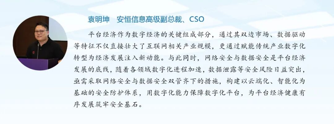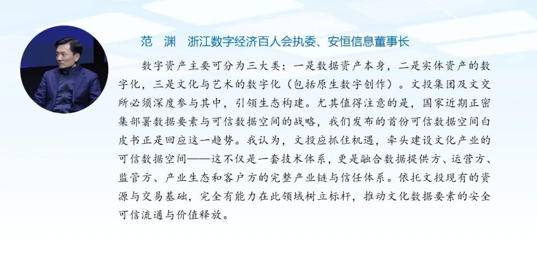 会上,百人会顾问、浙江省人大常委会原副主任王永昌,百人会顾问、 浙江省科普联合会 会长、浙商发展研究院院长、十二届浙江省政协副主席周国辉,百人会顾问、中国工程院院士、之江实验室主任王坚,百人会顾问、 浙江省人民政府 参事、浙江省咨询委副主任孟刚共同发布《浙江数字经济百人会专家观点集》。 安恒信息 董事长范渊,高级副总裁、CTO刘博,高级副总裁、CSO袁明坤等专家分别就数字文化产业、数据要素、平台经济等领域发表的精彩观点入选。以下为精彩观点展示。