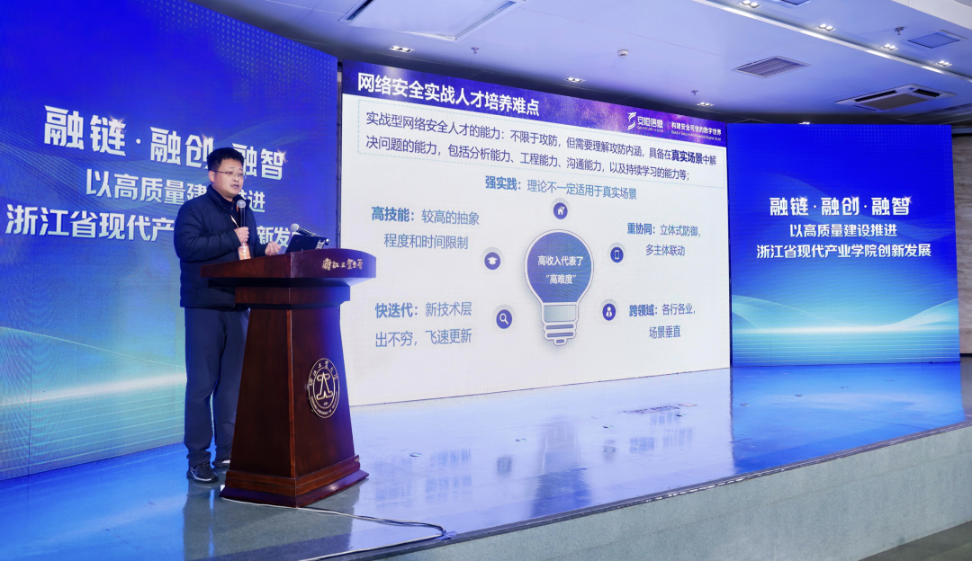12月13日,由 浙江省教育厅 、浙江省经济和信息化厅联合指导,浙江省现代产业学院联盟主办的2025年度浙江省现代产业学院高质量建设交流推进会在 浙江工业大学 顺利召开。基于 安恒信息 在数字安全产教融合体系建设和省级重点建设产业学院方面取得的显著成效, 安恒信息 首席人才官、高级副总裁、数字人才创研院院长苗春雨受邀出席会议,并作专题分享;同时, 安恒信息 与浙师大行知学院共建的网络空间安全现代产业学院,凭借深厚的建设积淀与显著的育人成效,成功入选浙江省现代产业学院建设典型案例。