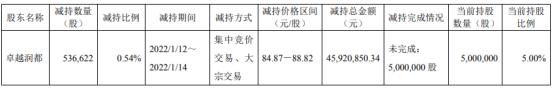 公告显示,减持前卓越润都合计持有公司股份5,536,622股,占公司普通股总股本5.54%,本次减持后持有股份5,000,000股,占公司普通股总股本比例为5%。
