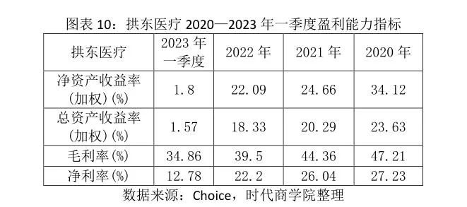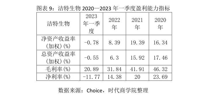 从图表9可以看出,洁特生物的盈利能力整体呈下滑趋势,2023年一季度出现亏损。