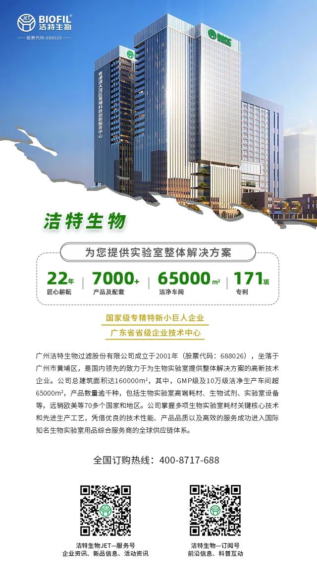 广州洁特生物过滤股份有限公司成立于2001年,坐落于广州市黄埔区,是一家致力于为生物实验室提供整体解决方案的高新技术企业。公司总建筑面积达160000㎡,其中,GMP级及10万级洁净生产车间超65000㎡。