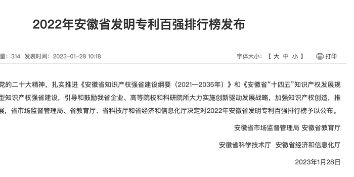 本次发布专利百强榜,是安徽省扎实推进《安徽省知识产权强省建设纲要(2021-2035年)》和《安徽省“十四五”知识产权发展规划》实施,旨在加快创新型知识产权强省建设,引导和鼓励安徽省企业、高等院校和科研院所大力实施创新驱动发展战略,加强知识产权创造,推动知识产权高质量发展,以科技赋能产业发展,加快安徽“科技创新策源地”建设。