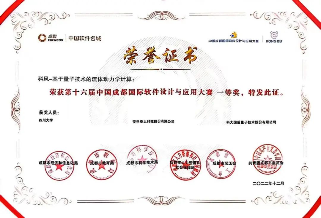 国盾量子与四川大学、安世亚太共同设计的“科风-基于量子技术的流体动力学计算”软件,获得“软件算法创新大赛”第一名。