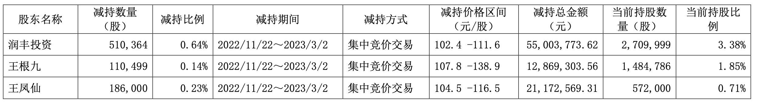 也就是说,润丰投资、王根九及王凤仙通过集中竞价交易方式合计拟减持公司股份数量不超过160.3846万股,合计减持比例不超过公司总股本的2%。目前,此次减持计划数量已过半,尚未实施完毕。