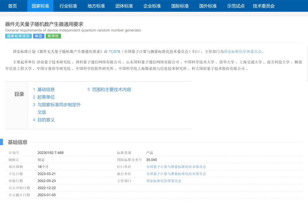 C114讯 4月3日消息(颜翊)近日,国家标准化管理委员会下达2023年第一批推荐性国家标准计划,量子随机数领域首个国家标准获批立项。
