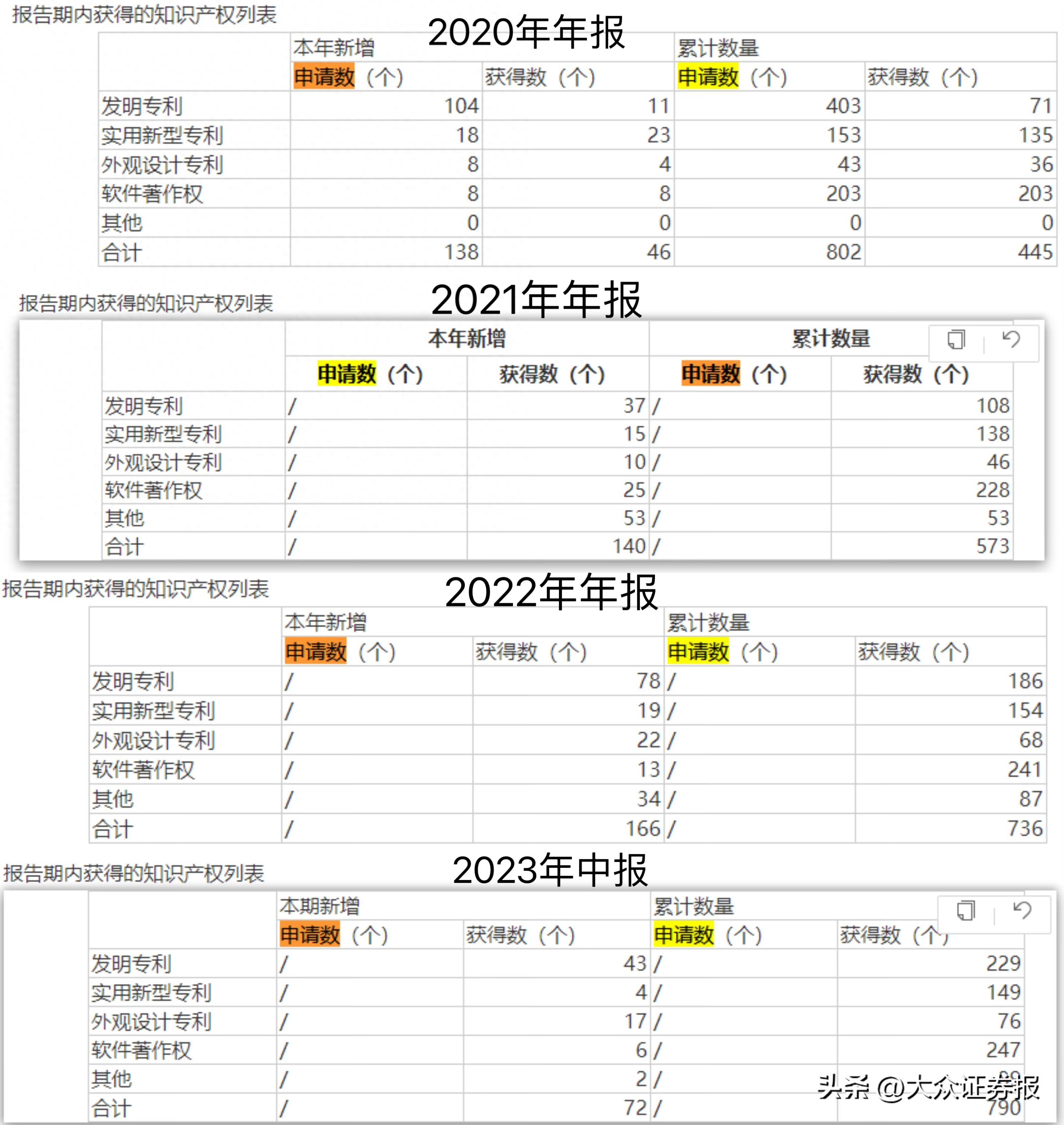 其次,在专利申请数量上方面,记者发现,国盾量子在2020年年报中,披露有104个新增发明专利申请。但自此以后,2021年年报、2022年年报以及2023年半年报,累计两年半的时间,国盾量子发明专利的申请数均显示为“/”,不仅如此,软件著作权的新增申请数也显示为“/”。同期公司研发支出之和超过3亿元。