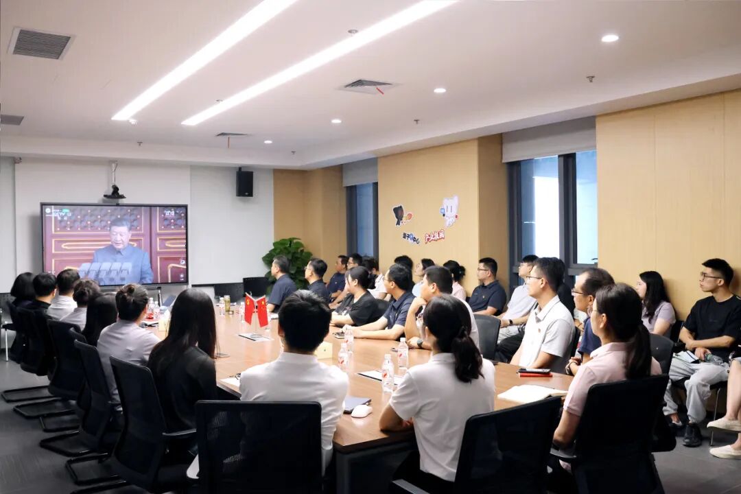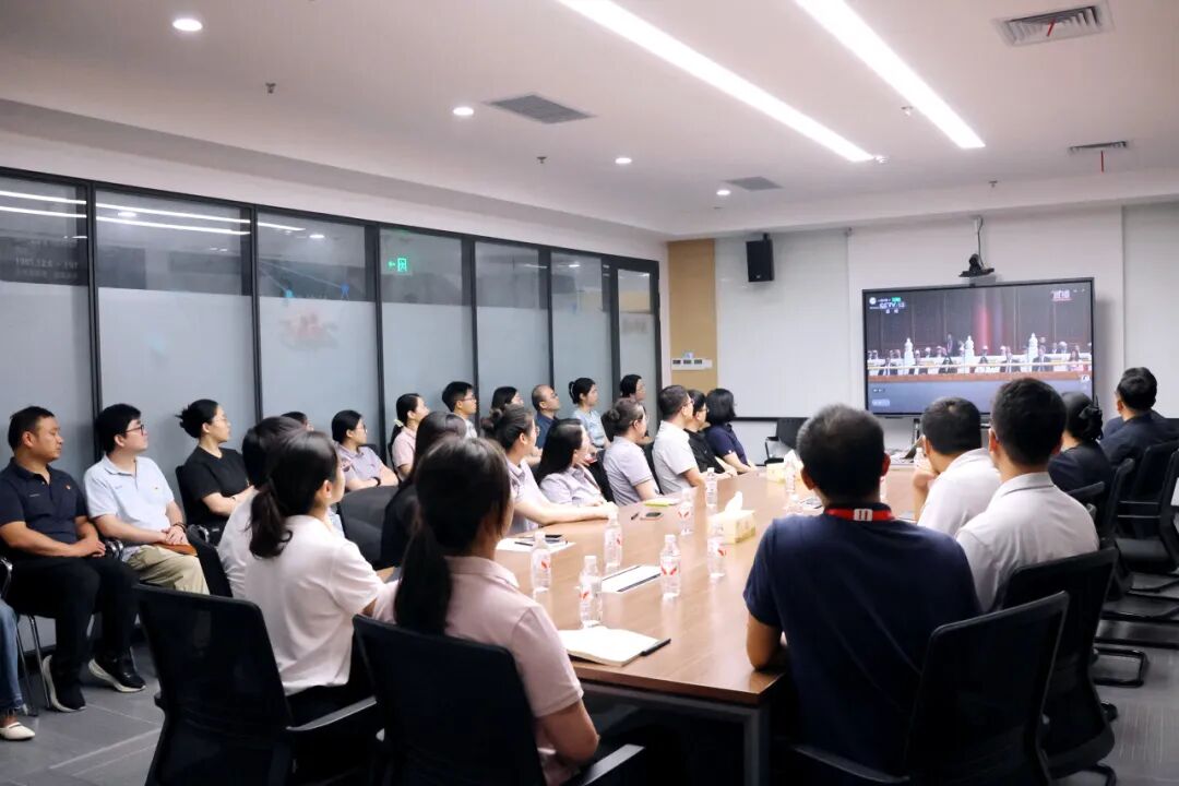 阅兵仪式直播开始后,大家整齐就座,全程认真观看各个环节。当诞生于抗战烽火中的国歌响起,全体人员自发起立,齐声高唱这激昂的旋律。整个观看过程中,大家全神贯注,不时向受阅部队的雄壮军容、新型武器装备的精彩亮相表示赞叹。