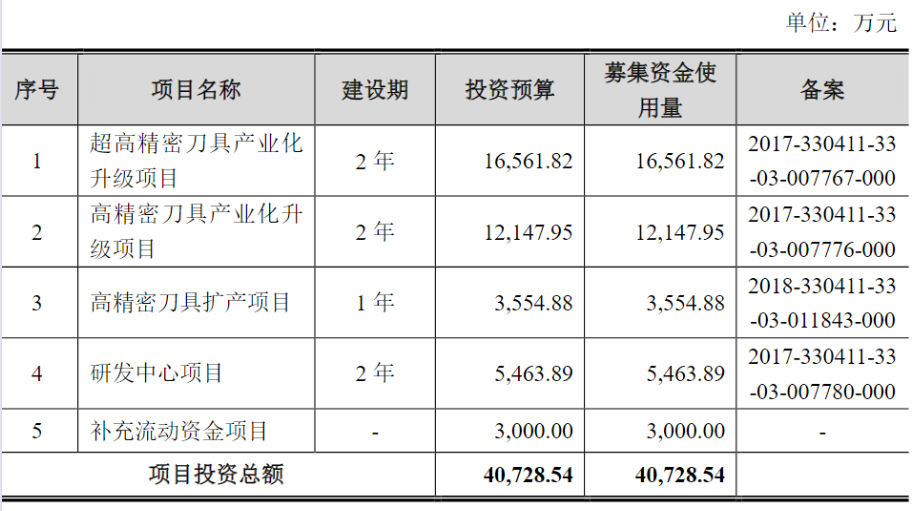 沃尔德本次发行募集资金总额为53,360.00万元,扣除发行费用后的募集资金净额为46,927.11万元,比原计划少6,198.57万元。沃尔德2019年7月18日披露的招股书显示,公司拟募集资金40,728.54万元,用于超高精密刀具产业化升级项目、高精密刀具产业化升级项目、高精密刀具扩产项目、研发中心项目、补充流动资金项目。