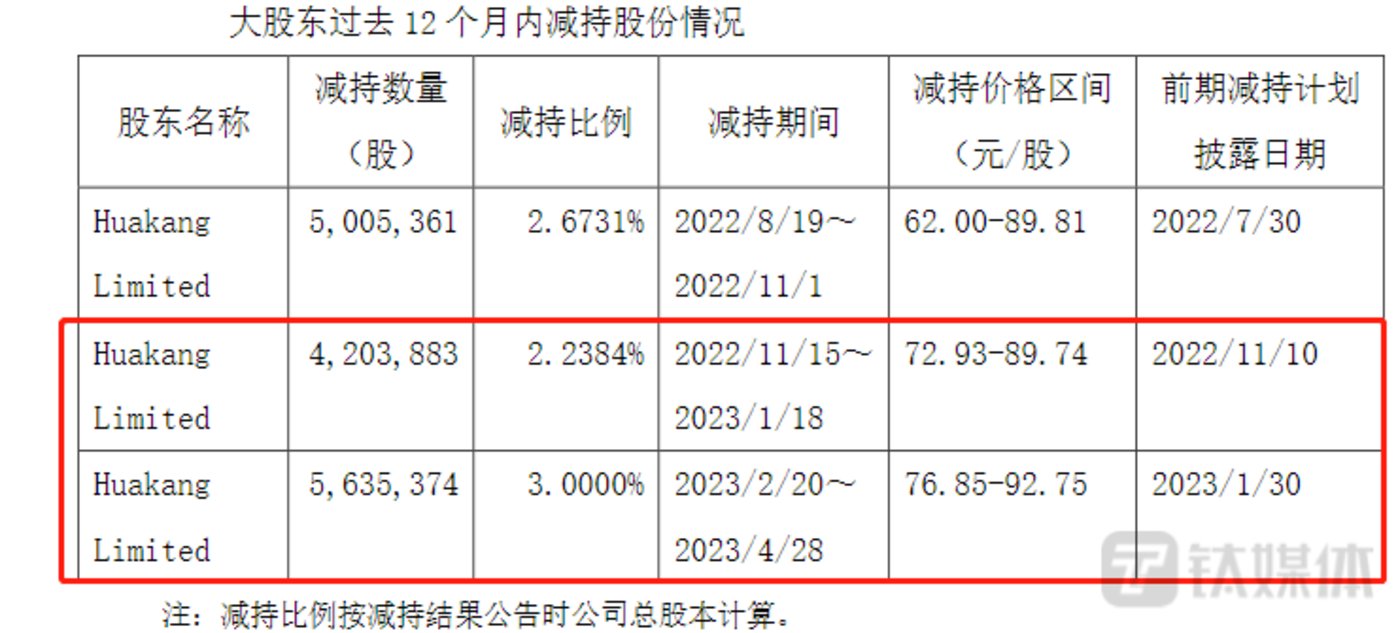 事实上,今年以来,Huakang Limited已进行过多次减持。2023年2月20日至4月28日,Huakang Limited通过集中竞价、大宗交易方式合计减持563.54万股,占总股本的3%。减持价格区间为每股76.85元-92.75元,共计套现4.73亿元。