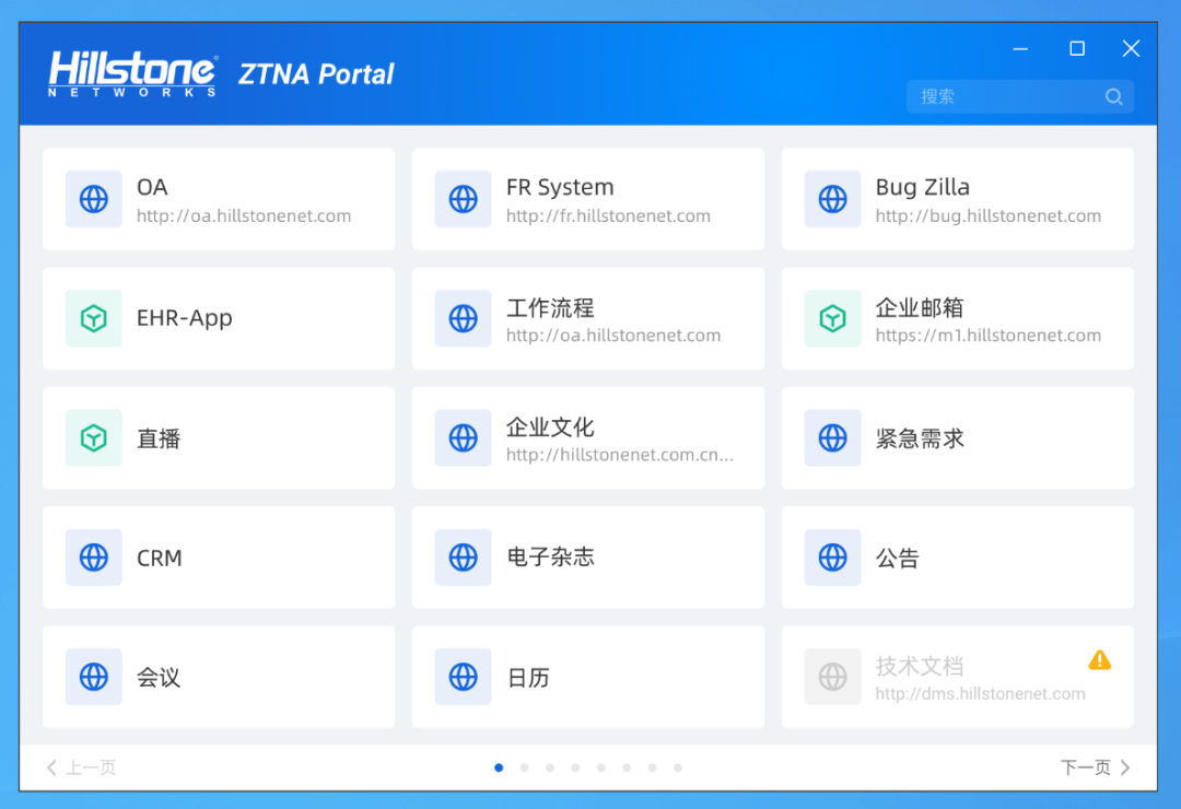 应用发布:以零信任方案接入的客户端,支持推送被授权的应用和数据访问入口,可一键跳转、自助登录。客户端能针对受限访问的应用,提示其受限原因,并提供终端关键系统版本、软件版本升级方式。