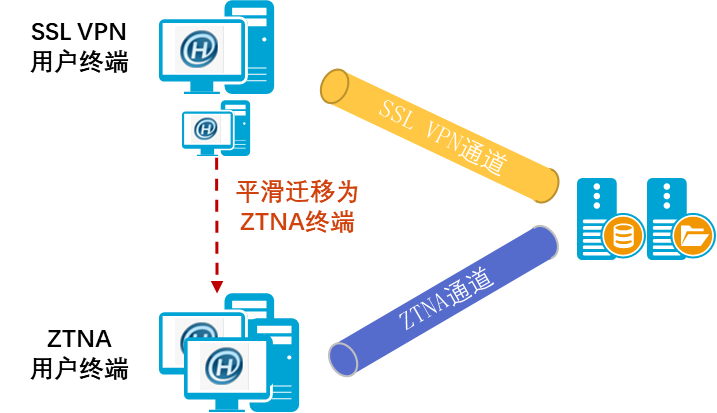 兼容SSL VPN:零信任网关和客户端同时支持SSL VPN和ZTNA用户接入,用户无差异化接入感知,且保护企业Capex投资。管理员可根据业务演进,将SSL VPN用户逐步平滑升级为ZTNA用户。