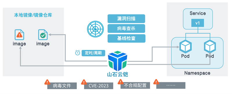 除了合规性检查,山石云铠还支持容器和镜像的漏洞扫描和病毒查杀功能。通过进行漏洞扫描,山石云铠可以及时识别和报告容器和镜像中已知的漏洞,以便用户及时修复。同时,通过病毒查杀功能,它能够检测和清除容器和镜像中的潜在病毒文件,有效预防黑客攻击。