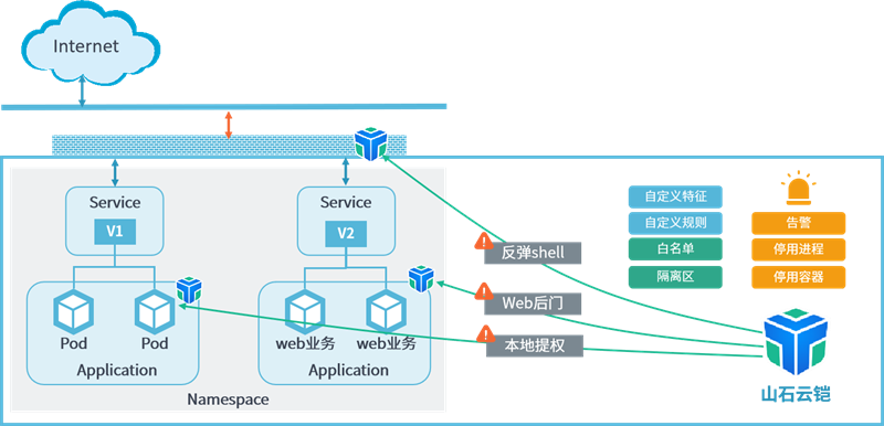 对于发现的威胁,山石云铠支持自动告警,及时通知安全管理人员发现的入侵事件。此外,山石云铠还可以停用相关进程或容器,有效阻断攻击的进一步扩散和影响。对于风险容器,山石云铠还支持基于微隔离技术进行隔离,限制其对其他容器和系统的影响,提高整体安全性。