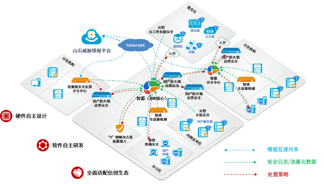 因此,山石网科基于多年的硬件自主设计、软件自主研发经验,依托丰富的安全产品线,推出了国产化安全运营平台和多个国产化安全组件。通过“x”种自主可控的安全解决方案,构建全新XDR架构下的安全运营,以实现“可靠”安全运营。