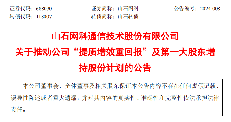 1月31日,山石网科发布《关于推动公司“提质增效重回报”及第一大股东增持股份计划的公告》,内容摘要如下: