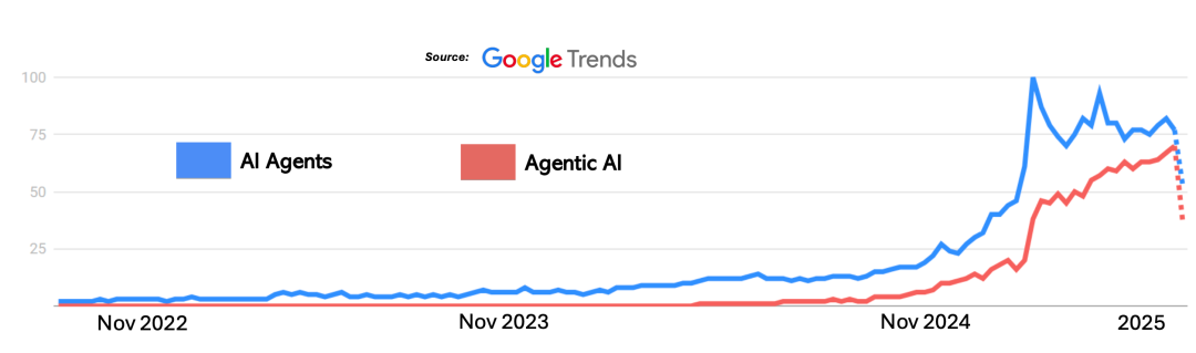 自2022年11月ChatGPT发布以来,全球谷歌搜索数据显示"AI Agent"和Agentic AI"的搜索量出现显著的上升趋势,见下图。
