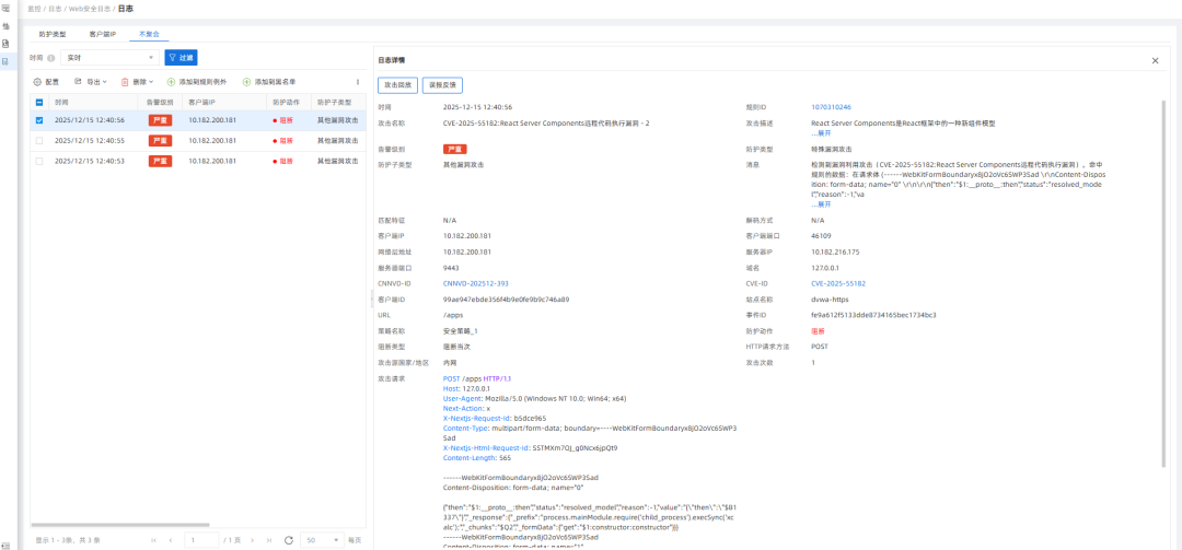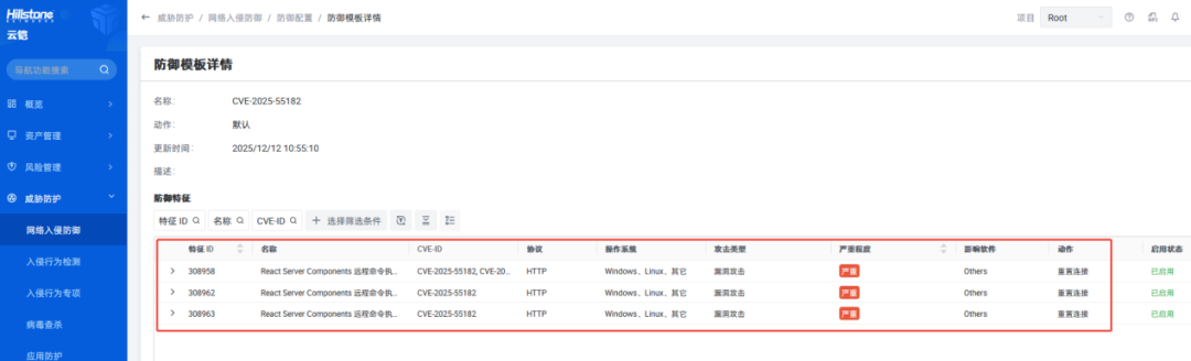 React作为前端开发领域的主流框架,用户基数庞大且覆盖各类Web项目,此次漏洞影响范围极广,给相关业务系统带来严重安全威胁。作为网络安全头部厂商, 山石网科 针对CVE-2025-55182漏洞的攻击特性快速响应,于漏洞披露后24小时内完成攻击特征提取,并将其纳入安全防护规则库并同步生成专项防御规则,且所有规则默认启用,形成针对性深度防护方案。