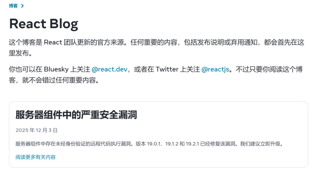 近期,React披露高危漏洞CVE-2025-55182,该漏洞源自React 19新增的Server Components(RSC)功能,属于严重反序列化漏洞。攻击者无需身份验证,仅通过构造恶意HTTP请求即可在服务器端执行任意代码,极端情况下可能导致服务器被完全接管,其CVSS评分为10.0(Critical,最高风险等级)。