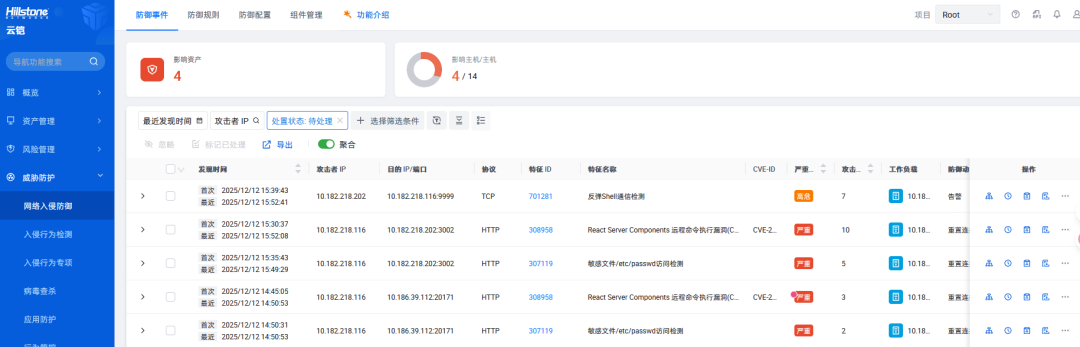 以部署 山石网科 云铠CNAPP的用户为例:通过网络入侵防御功能,即可实时监控React服务进程的高危模块调用、敏感文件访问等异常行为,重置利用该漏洞的恶意HTTP请求,精准阻断攻击者构造的反弹Shell等攻击操作;即便暂未完成漏洞补丁升级,也能有效抵御风险,为后续补丁的规划、测试与部署争取充足的安全窗口期。